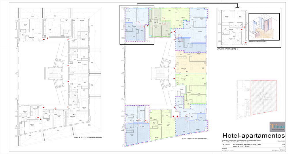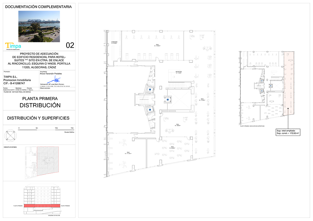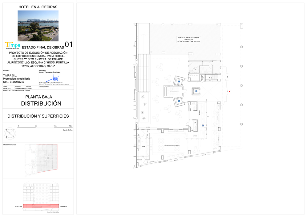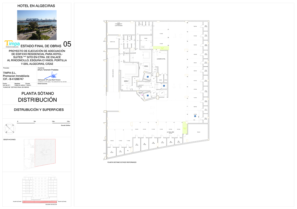 Se diseñó la adecuación del edificio para su explotación como Hotel-Apartamento, adecuando así la planta baja a los usos habituales de zonas comunes de un hotel, la planta primera a salas de usos varios, y los apartamentos existentes a unidades de alojamiento.